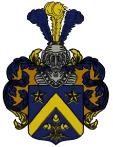 The shield is in the form of "Tiercé en chevron", which was a symbol of protection and conservation, martial valor, resistance and strength.[9] The tincture of the coat of arms is held in blue and gold. The golden rafter is accompanied above by two golden stars. Below is a bundle of three golden acorns tied together with a golden ribbon. The helmet is held in silver and has seven grids. The crest consists of a golden between two blue ostrich feathers. In addition, the helmet is surrounded by blue-golden blankets.