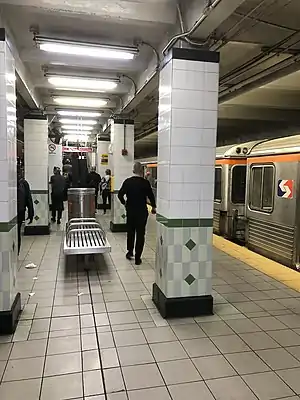 It is the southernmost station in the Center City Concourse, the 500,000+ sq ft underground pedestrian concourse in Center City, which extends to Spruce Street.[1] The concourse connects to City Hall Station, the Market–Frankford Line, Subway–Surface Trolley Lines, Regional Rail and PATCO Speedline's 12–13th & Locust Station and 15–16th & Locust Station. However, no free interchange is available.