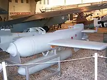The Hs293 has been variously described as a missile or as a boosted glide bomb.[1] It consisted of an SC500 bomb casing, fitted with wings, engine and radio control. Control equipment was housed in a rearward extension of the bomb casing but the motor was mounted in a separate housing beneath. It had originally been developed as an unpowered glide bomb, "Gustav Schwartz Propellerwerke", and the engine was added later. After flight tests, a visible tracking flare was also added, in a further rearward extension.[2]