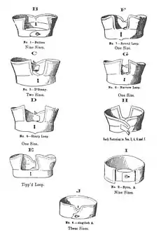 One of Hunt's popular inventions was a paper shirt collar. This time he sold the patented design and negotiated for royalty payments, but the item only became popular after he died.[3] The unusual item was first put on sale in New York City in 1854 and used then mostly for stage purposes. In time it became fashionable and the general public then started using them. High production of the item came about and at one time there were as many as forty factories making paper collars in the United States. The manufactured output in 1868 became 400,000 that were sold to the general public.[55]