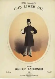 Born in Hendon, he worked as a beer and wine seller before becoming a professional performer in the 1870s. He became well known as a singer of "coster songs",[1] and for parodying the style of popular lions comiques, in particular George Leybourne, with songs such as "Fashionable Fred".[2] Leybourne was known for driving around the capital in a carriage drawn by four white ponies; Laburnum used a cart drawn by four donkeys. Laburnum also sang "Dr De Jongh's Cod Liver Oil", mocking the use of fashionable new medical remedies.[3] He was known as "The Star of the East", a reference to the East End of London.[4]