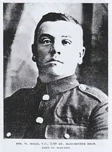 Mills was 23 years old and a private in C Company,[1] the 1/10th Battalion, Manchester Regiment, in the British Army when the following events occurred.