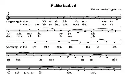 - The complete melody of the Palästinalied, "Nû alrêst lebe ich mir werde" (L14, 38; C 7)