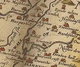 Castlesteads Mansion is one of the most important buildings in Walton.[4] It is listed as a grade II building.[13] It was built at the end of the 18th century by the Johnson family.[4] It is believed that the estate was previously owned by the Dacre family who built "Walton House" using stones from the nearby Hadrian's Wall. The Johnson family purchased the estate in 1789 and replaced "Walton House" with a larger mansion, known as Castlesteads. It is located on the site of the Roman fort of Camboglanna.[14] The mansion is south east of Walton[4] and is surrounded by 75 acres (30 ha) of woods, it also looks over the River Irthing.[4] In 1839, William Ford described Castlesteads in his journal as being "an elegant and modern residence." At the time of this description Castlesteads was known as "Walton House" and was occupied by William Johnson. Ford also states that many "Roman remains" were dug up and are preserved at Castelesteads.[6]