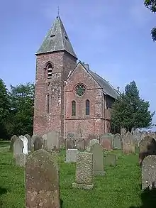 The church in Walton is St Mary's Church. It is an active Anglican Parish Church.[10] The church was built in 1869 on the site of a medieval church,[11] it is believed to have cost at least £2000.[3] The church was designed in a Gothic style by the architects Paley and Austin who were based in Lancaster, Lancashire.[12] The church consists of a chancel, nave, north aisle, a tower and a porch.[3] Within the church there are brass plaques set into the floor, commemorating the Johnson family, who occupied the Castlesteads mansion on the site of the Hadrian's Wall fort of Camboglanna. The brass plaques date from 1821 to 1865.[11]