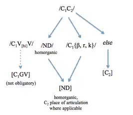 Complex onsets and codas are not permitted in Wamesa, and consonant clusters across syllable boundaries are usually reduced, such that /C1C2/ surfaces as [C2]. However, there are three exceptions to this; clusters of homorganic nasals and voiced plosives are permitted to surface, as are consonant-glide clusters that form through the morphophonological processes described above. Additionally, an underlying cluster of a consonant followed by /β/ /r/ or /k/ does not reduce but surfaces as a nasal followed by a homorganic voiced plosive, both of which derive their place features from underlying /C2/.