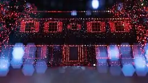 The series' main title sequence was created by Perception, and starts with a "please stand by" visual in the style of the episode's sitcom era. This is followed by close-ups of footage from the episode on a television screen, which the camera then pushes through to show the RGB pixels that form television images. The pixels are rendered as hexagons, as a reference to Maximoff's hex abilities and the informal name "The Hex" that is given to the sitcom reality. The pixels form various elements from the series including Maximoff and Vision's house, the baby mobile from the third episode, and the Westview water tower,[143] which is reminiscent of the art style in "House of M".[144][145][146] The pixels are then disrupted by a single red pixel that represents Maximoff's "world falling apart around her", before forming two wedding rings at the end of the sequence since the series is "at its core a love story".[143] Charles Pulliam-Moore at io9 felt the credits were "undeniably Marvel in the big screen sense", despite WandaVision otherwise attempting to embrace its streaming series format.[145]