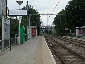 The tram stop is located on a double track section of line, with platforms on either side of the track. Immediately to the east of the stop, the line reduces to single track and rises on a steep gradient in order to pass over the railway line on a bridge.