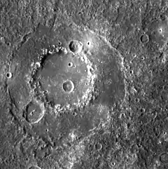 Regional view from MESSENGER's first flyby showing Wang Meng below left of center, Judah Ha-Levi at center, and Glinka in upper right.