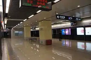 Wangjiawan station (simplified Chinese: 王家湾站; traditional Chinese: 王家灣站; pinyin: Wángjiāwān Zhàn), is a station on Line 4 of the Nanjing Metro that opened in January 2017 along with eighteen other stations as part of Line 4's first phase. The station is located underneath the T-intersection of Jiangwangmiao Avenue and Dongfang Road on an east–west axis and is within walking distance of Purple Mountain.[1] Originally named Jiangwangmiao Station during Line 4's planning phase, that name was later transferred to the immediately preceding station to the west.[2]