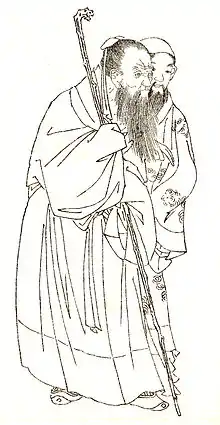 His name is not straightforward either. The Kojiki calls him "Wani Kishi".[6] The Nihon Shoki and most of the subsequent documents read 王仁. Although the reading Wani is irregular (the standard reading is Ō Jin or Ō Nin), these characters look like a Chinese name (the surname Wang and the personal name Ren). This leads some scholars to consider that Wani was of Chinese descent, which his descendants claim was the case.[7][8] A supporting fact is that the Wang clan was powerful in China's former Lelang Commandery in northwestern Korea. After the downfall of the commandery around 313, some members of the Wang clan might have fled to Baekje, and then to Japan.[9][10] A more skeptical view is that the legend of Wani was influenced by much later events: the surname Wang was selected as the most appropriate name for the ideal man of letters because in the late 6th century, several scholars surnamed Wang came to Japan from southern China via Baekje.[11]