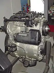 A Wankel Diesel engine shares its basic design, a triangular-like rotor in an oval, epitrochoid-shaped housing, with a regular Wankel engine. The key difference is that it shares all of its operational characteristics with a Diesel engine. In addition to this, supercharging is required: A regular Diesel engine achieves compression ignition by a high compression ratio, which cannot be done in a Wankel engine due to the shape of the Wankel combustion chamber; supercharging ″artificially″ increases the compression ratio to ensure that compression ignition takes place.[2] Several different approaches of designing a supercharger for a Wankel Diesel engine exist. Wankel designed an external supercharger,[3] whereas Rolls-Royce added a secondary supercharging rotor of a bigger size, making the engine a two-stage rotary, which gave the housing an "8"-like appearance.[4]