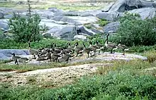 The park was set up to protect the environment and the Cree traditions. It is a young landscape formed by erosion from the last glacial period, which forms many subarctic habitats.[7] Evidence of this is seen from the glacial features like moraines, eskers and strand lines left by moving glaciers.[13] This glaciation resulted in environments like far extending beaches and plains dipping towards Hudson Bay.[13] The geography consists of coastal tundra habitats with coastal marshes, beach ridges and freshwater sedges which make up the habitats there.[14] The climate here is subarctic and wet, having many rivers and bogs called "Muskeg" by the indigenous Cree people native to that area.[13] In terms of ecology, Wapusk's location is part of the Hudson Plains ecozone.[7]