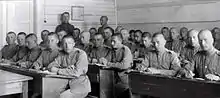 On 30 August, the Council of People's Commissars of the Lithuanian SSR officially ordered the reorganization of the War School into the infantrymen school.[73] On 12–14 September, the school relocated to Vilnius.[73] Two days later, it officially adopted the statute that was copied from Red Army schools.[74] Cadets showed dissatisfaction with the new regime; for example, they sand Tautiška giesmė or tossed communist posters.[75] Therefore, the Soviets started removing politically unreliable cadets.[76] The school hastened the completion of studies for the 22nd class (69 cadets were assigned to the 29th Territorial Rifle Corps on 15 September).[77] The 23rd class was enlarged by 52 cadets on 8 September[23] only to be dispersed in November.[77] The Russian curriculum did not provide for aspirants and the last class of the reservists graduated on 2 October.[77] On 13 November 1940, the school was officially transferred to the jurisdiction of the Red Army thus marking the official termination of the War School.[78]