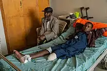 War rape and sexual violence have been widespread throughout the war, and has been perpetrated by virtually all sides.[35] According to one witness in May 2021, girls as young as 8 and women as old as 72 were among those affected by sexual violence.[36] Such sexual violence is often accompanied with other type of physical and mental abuse. With physical abuses included burning their victims with hot iron or cigarettes, forcing metal rods or nails into their victim's genitals, etc.[37][35] Mental abuses including raping their victim in front of their family members, forcing their victims to rape their family members, calling their victims by derogatory words and ethnic slurs, etc.[38][37] After being subjected to sexual violence, many women become infected with STIs like HIV, and its often hard for them to find treatments due to the collapse of medical infrastructure during war and senses of shame.[39]