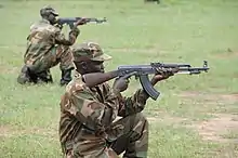 Auma was able to organize a highly centralized rebel group by stating that the HSM was led and supported by spirits.[41] Overall, Auma claimed that 140,000 spirits had been sent by God to aid and protect her army; these spirits had jobs, ranging from military to civilian duties. In combat, the spirits were supposed to shield HSM fighters from bullets, and if a HSM fighter was killed, they would rejoin the community by becoming another spirit. Researcher Heike Behrend described this as a form of "ancestor cult".[46] Besides the regular spirits, there were special spirits who formed the HSM's high command – they had different personalities, and possessed Auma when the need arose. "Lakwena" ("messenger" or "apostle" in Acholi) was the spirit of a pious Italian who had drowned in the Nile; he acted as chief commander.[47] His deputy was the aggressive female Arabian spirit "Miriam".[48] In addition, there were many spirit sub-commanders heading various sections of the HSM. For example, the Chinese or North Korean spirit "Ching Poh" was responsible for weapons as well as transportation.[47][lower-alpha 2] As the spirit commanders acted through Auma, she was able to keep firm control over her army.[41] The belief in supernatural support provided the Holy Spirit Movement with cohesion and an attractive ideology which integrated Christianity with local heterodox belief systems. In addition, Auma implemented draconian discipline and a strict code of conduct, organizing a military police and logistics groups to enforce these and keep the HSM well-organized.[10] The HSM generally used human wave attacks which were successful when encountering less trained enemies, but often failed catastrophically against well-armed enemies.[50] In addition, the HSM also terrorized civilians through looting and killings despite its official policies.[41]