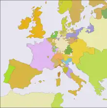 Under the treaties of Westphalia in 1648, Aix-la-Chapelle in 1668 and Nijmegen in 1678, France acquired territories in the Rhineland and along its northern border with the Spanish Netherlands.[2] When a town changed hands, it normally included the economic hinterland surrounding it but treaties often failed to define the boundaries of these dependent regions. Although willing to negotiate those within the Spanish Netherlands on a bilateral basis, Louis regarded acquisitions in Alsace and Lorraine as essential to securing his borders. For these areas, he set up "Chambers of Reunion" to determine whether France had been awarded all the territory owed; since those appointed to the Chambers were French lawyers, the normal result was to demand additional concessions but as these generally consisted of small towns and villages, they went unopposed.[3]