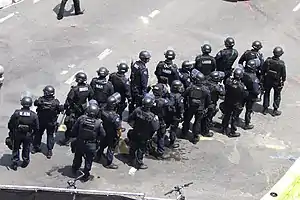 Observers have noted the militarizing of the policing of protests.[10][11] Since the 1970s, riot police have fired at protesters using guns with rubber bullets or plastic bullets.[12] Tear gas, which was developed by the United States Army for riot control in 1919, is still widely used against protesters. The use of tear gas in warfare is prohibited by various international treaties[13] that most states have signed; however, its law enforcement or military use for domestic or non-combat situations is permitted.