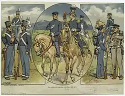 The war was fought by regiments of regulars and various regiments, battalions, and companies of volunteers from the different states of the Union as well as Americans and some Mexicans in California and New Mexico. On the West Coast, the U.S. Navy fielded a battalion of sailors, in an attempt to recapture Los Angeles.[54] Although the U.S. Army and Navy were not large at the outbreak of the war, the officers were generally well trained and the numbers of enlisted men fairly large compared to Mexico's. At the beginning of the war, the U.S. Army had eight regiments of infantry (three battalions each), four artillery regiments and three mounted regiments (two dragoons, one of mounted rifles). These regiments were supplemented by 10 new regiments (nine of infantry and one of cavalry) raised for one year of service by the act of Congress from February 11, 1847.[55] A large portion of this fighting force consisted of recent immigrants. According to Tyler V. Johnson, foreign-born men amounted to 47 percent of General Taylor's total forces. In addition to a large contingent of Irish- and German-born soldiers, nearly all European states and principalities were represented. It is estimated that the U.S. Army further included 1,500 men from British North America, including French Canadians.[56][57]