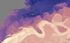 A warm core ring is a type of mesoscale eddy which forms and breaks off from an ocean current, such as the Gulf Stream or the Kuroshio Current. The ring is an independent circulatory system of warm water that can persist for several months before losing its distinctive identity.[1] Warm core rings also form in certain powerful ocean currents, such as the Kuroshio and the Gulf Stream. Warm core rings can be detected using infrared satellites or sea height anomalies resulting from and are easily identifiable against the surrounding colder waters. In addition, warm core rings are also distinguished by their low levels of biological activity. This type of system is thought to have helped develop several hurricanes, most notably Hurricane Katrina, into significantly stronger storms due to the abundance of warmer ocean water reaching down to a significant depth,[2] which in turn fuels and intensifies the hurricane. Warm core rings are also known for affecting wildlife, having the capacity to bring wildlife from typically warm waters to areas typically dominated by cold waters.