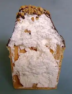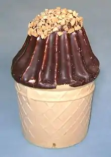 Warm ice cream (Polish: ciepłe lody) is a Polish dessert made of egg white-based mousse topped by syrup, chocolate, or other topping, and presented in a waffle cup, resembling soft serve ice cream, and as such giving name to the dessert. Relatively cheap, it is also high in calories.[1]
