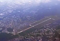 ![]() View of the airport from the air to the southwest. The photo draws attention to Powstańców Śląskich Street which is a street on the path of the former second runway. The paved runway 10R/28L in use is only a part of its former length. | |||||||||||||||