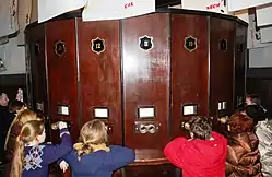The Warsaw Fotoplastikon has 24 fixed stereoscopic viewports. A visitor sits at a viewport around the circumference of the machine. Each picture, from a sequence of 48 three dimensional stereo images, appears for 15 seconds before moving on to the next. Above each viewport is a window which displays an illuminated card with a brief description of the scene below. The scenes are arranged by themes, such as a travelogue to distant lands or depictions of historic events. Recorded music related to the theme plays in the background. The Fotoplastikon uses a slightly modified version of the Kaiserpanorama peepshow system, differing in having 24 viewports instead of 25 in the Kaiserpanorama system.[1]