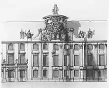 The next reconstruction project of the Royal Castle appeared after Augustus III took to the Polish throne in 1733. New plans, which were formed in 1734 and developed in 1737 by architect Gaetano Chiaveri, saw among other things, the reconstruction of the castle's façade on the Vistula side in the rococo style, which was meant to form a new so called Saxon elevation and also the conversion of the north-east part with the Altana Tower, where it was planned for 3 two-storey avant-corps (risalto) to be built on.[9][13] The reconstruction work according to these plans was carried out with various intensity between 1740 and 1752. During the period of 1740–1747 the façade on the Vistula side was reconstructed in the late baroque style (architects: Gaetano Chiaveri, Carl Friedrich Pöppelmann, Jan Krzysztof Knöffel).[13] One of the best sculptors who did work on the castle in this period was Jan Jerzy Plersch, who made the royal decorative frames, mouldings and statues called the Famous Figures, which held the royal crowns on the top of the middle risalto, of the Saxon elevation, on the Vistula side. The last reconstruction work of this period was finished by late 1763, after the death of Augustus III, when Plersch made the last sculptures and frames with province emblems for the Parliament Hall.[13]