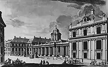 The Copper-Roof Palace has since 1989 been a branch of the Royal Castle Museum.[27] The palace is contiguous with Warsaw's Royal Castle, and down a slope from the Castle Square and Old Town. It was originally a patrician house of Wawrzyniec Reffus, it was built 1651–1656.[28] After 1657 destruction by the army of George II Rákóczi, it was completely remodeled in 1698–1701[9] for Jerzy Dominik Lubomirski.[28]