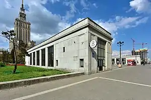 The present structure was built between 1955 and 1963, based on the designs of architects Arseniusz Romanowicz and Piotr Szymaniak (overground portion) and Warsaw Academy of Fine Arts artists Wojciech Fangor, Jerzy Sołtan, Zbigniew Ihnatowicz, Wiktor Gessler, Adolf Szczepiński, Bogusław Smyrski and Lech Tomaszewski (underground portion). The overground part consists of two rectangular buildings without any facilities, being effectively oversized shelters for staircases leading to the platforms, ticket offices, etc. The station underwent a refurbishment in 2006–2007.