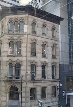 Washington Block is a Chicago Landmark building located in the Loop community area of Chicago, Illinois, United States. Designed by Frederick and Edward Baumann, it was built between 1873 and 1874 in the aftermath of the Great Chicago Fire of 1871. It was designated a Chicago Landmark on January 14, 1997.[1] When completed, Washington Block was one of the tallest buildings in the city of Chicago and is described as a rare example of the "isolated pier foundation" (see below) which contributed to the foundation of knowledge that has made Chicago the birthplace of the skyscraper.[1] The building has limestone facades and originally included an exterior staircase that led to a second-floor corner entrance. The lobby has a curving hardwood staircase.[1] Today the first floor is occupied by a 7-Eleven and the second floor occupied by Carter Legal Group PC.[2][3] The building, which is located at the corner of North Wells Street and West Washington Street is five stories tall.[4]