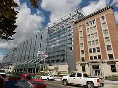 With few hotels near the new convention center, there was a need for a "convention headquarters hotel". In May 1999, Monument Realty proposed constructing a 1,000-room convention headquarters hotel on a 51,000-square-foot (4,700 m2) lot it owned on a roughly triangular parcel bounded by New York Avenue NW, K Street NW, and 10th Street NW.[3] Monument estimated the hotel would cost $206 million. In order to make the venture profitable, the cost would need to be reduced to $169 million. Monument sought $57.3 million in tax increment financing (TIF) but never received approval from the city for the funds.[4] In late October 2000, Monument Realty sold the parcel for $43.2 million to Boston Properties.[5] An office building, 901 New York Avenue, was built on the site. In fall 1999, the Washington Renaissance Hotel at 9th and I Streets NW applied for $25 million in TIF money to expand into a convention headquarters hotel. But city officials turned down this request, saying there was significant risk it would not produce the tax revenue to make the TIF financially viable. D.C. Councilmember Jack Evans introduced legislation to award the TIF to the Washington Renaissance Hotel,[6] but it did not pass and the hotel's owner sold the land on which the expansion would have occurred. The hotel would have expanded onto an empty lot on the northwest corner of 7th and I Streets NW. The International Brotherhood of Electrical Workers Building was constructed on this quarter-block site in 2004.[4]