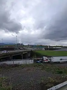 SR 432 begins at an intersection with the Ocean Beach Highway, signed as SR 4, in West Longview in Cowlitz County. The two-lane highway travels southeast as Willow Grove Connection Road and Industrial Way around Mount Solo and into the city of Longview. The four-lane SR 432 parallel to a Columbia and Cowlitz Railway line and the Columbia River through the Port of Longview and intersects the northern terminus of SR 433, which travels on Oregon Way and the Lewis and Clark Bridge to Rainier, Oregon. The highway turns northeast onto 3rd Avenue and crosses a BNSF rail line before it intersects the Tennant Way divided highway and the southern terminus of SR 411 in a partial cloverleaf interchange.[3] The SR 432 designation travels onto four-lane Tennant Way grade-separated highway and continues southeast, parallel to a BNSF rail yard, before intersecting Dike Road in a partial cloverleaf interchange and crossing over the Cowlitz River into Kelso.[4] The highway travels south of Southwest Washington Regional Airport and intersects Talley Way in a partial cloverleaf interchange before intersecting I-5.[5] The partial cloverleaf interchange, nicknamed the Longview Wye,[6] serves as the eastern terminus of SR 432 while the roadway continues south as the Old Pacific Highway.[7][8][9]