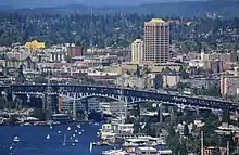 The first section of the freeway within Seattle to be built was the Ship Canal Bridge, a double-decker bridge over the Lake Washington Ship Canal between the University District and Eastlake, which began construction in August 1958.[186] Construction of the freeway through Downtown Seattle was delayed after 100 citizens marched on June 1, 1961, in protest of the "trench" design and sought to add a lidded tunnel with a rooftop park.[187][188] The proposed design change was deferred for later consideration, but delayed the start of construction south of Olive Way to the following year.[189]