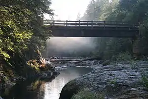 The Washougal River is a 33-mile (53 km) tributary of the Columbia River in the U.S. state of Washington.[3] Its headwaters and upper 21 miles (34 km) are in Skamania County in the Gifford Pinchot National Forest, and its lower 12 miles (19 km) are in Clark County. The river, which flows through the city of Washougal and meets the Columbia at the City of Camas, is a popular stream for fishing, swimming, and boating.[3]