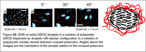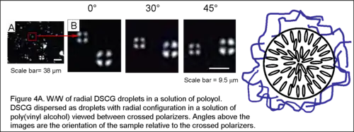 This water-in-water emulsion consists of liquid crystals suspended as water-solvated droplets dispersed in a solution of polymer whose solvent is also water. The liquid crystal component of the emulsion is disodium cromolyn glycate (DSCG). This molecule is an anti-asthmatic drug, but also exists as a special type of liquid crystal when the concentration of DSCG is ~9-21 wt%. Unlike conventional lyotropic liquid crystals which consist of oily molecules such as 5CB, DSCG molecules are not amphiphilic, but entirely water-soluble. Thus, the separation of hydrophobic/hydrophilic groups cannot be applied to DSCG. The polymer solution serves as the medium or continuous phase of the w/w emulsion. Apart from being water-soluble, one important criterium for the generation of this w/w emulsion system is that the polymer cannot bear functional groups that interact strongly with DSCG. As such, ionic polymer when mixed with DSCG does not form w/w emulsion, but gives rise to a homogeneous solution or a precipitate solution. Consequently, the known polymers that afford w/w emulsion include polyacrylic amides and polyols. Surprisingly, some of these water-in-water emulsions can be exceptionally stable from coalescence for up to 30 days. Because molecules of liquid crystal assume a preferred common orientation among themselves, the overall orientation of liquid crystals in a droplet is only stable in certain configurations (Fig. 3). As water solvated droplets in a w/w emulsion, DSCG molecules would align in a preferred direction on the surface of the droplet. To minimize the overall energy of the system, the DSCG molecules in the droplet prefer to align either parallel or perpendicular to the surfaces of the droplets.(Fig. 4A,B).