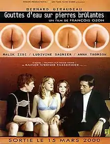 Water Drops on Burning Rocks (French: Gouttes d'eau sur pierres brûlantes) is a 2000 French romantic comedy drama film directed by François Ozon,[1] based on Rainer Werner Fassbinder's play Tropfen auf heißen Steinen.[2] The plot concerns a 50 year old businessman in 1970s Germany, who becomes infatuated with a man 30 years his junior.