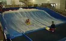 The flow rider was a shallow sheet of water, moving from 30–35 miles per hour, on which the rider could surf or "boogie-board". The water depth of the flow rider was 3 inches (76 mm).
