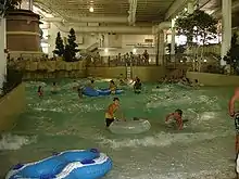 Below the slide tower was a wave pool, a lazy river, a swimming pool, a small pool with floating "logs" which children leapt across, a flow rider, two hot-tubs, and a children's area for smaller children.