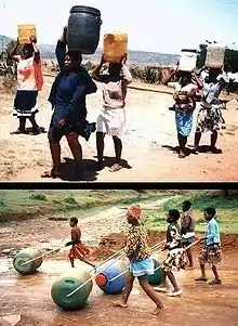 A water container, water canister or water can is a medium-sized portable container for transport, storage and use of water. Large plastic bottles are sometimes called "canisters". Water canisters can for example be used for drinking water, wastewater or showering. Water canisters are used for excursions, camping, boat trips, in cabins without tap water, or as a household drinking water reserve in case of emergency.