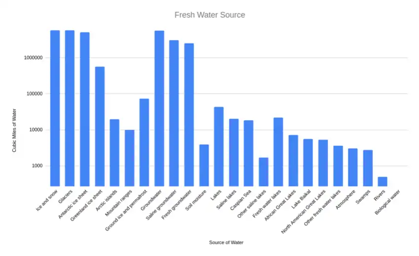| Source of water | Volume of water in km³ (cu mi) | % total water | % salt water | % fresh water | % liquid surface fresh water |