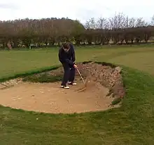 A hazard is an area of a golf course in the sport of golf which provides a difficult obstacle, which may be of two types: (1) water hazards such as lakes and rivers; and (2) man-made hazards such as bunkers. The governing body for the game of golf outside the US and Canada, The R&A, say that A "hazard" is any bunker or water hazard.[1] Special rules apply to play balls that fall in a hazard. For example, a player may not touch the ground with their club before playing a ball, not even for a practice swing. A ball in any hazard may be played as it lies without penalty. If it cannot be played from the hazard, the ball may be hit from another location, generally with a penalty of one stroke. The Rules of Golf govern exactly from where the ball may be played outside a hazard. Bunkers (or sand traps) are shallow pits filled with sand and generally incorporating a raised lip or barrier, from which the ball is more difficult to play than from grass.[2]