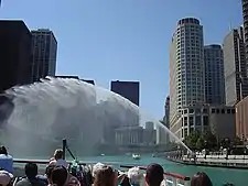 A water jet in a city, being fired over a river