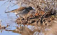 The water pipit's song is delivered from a perch or in flight, and consists of four or five blocks, each consisting of about half a dozen repetitions of a different short note.[5] In comparison, the European rock pipit's song is a sequence of about twenty tinkling cheepa notes followed by a rising series of thin gee calls, and finishing with a short trill.[12] The call of the water pipit is a single or double sharp "dzip" or similar, slightly harsher than soft sip sip sip of the meadow pipit or the shrill pseep of the European rock pipit. The short, thin fist flight call is intermediate between the sip of the meadow pipit and the rock pipit's feest.[5][11] The differences between the calls of the pipit species are very subtle, and not diagnostic in the absence of other evidence.[11] The flight call of the subspecies A. s. coutellii is shorter and more buzzing than that of the nominate race.[5]