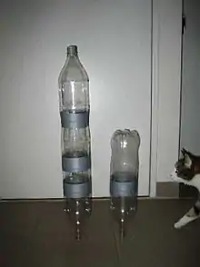 A water rocket is a type of model rocket using water as its reaction mass. The water is forced out by a pressurized gas, typically compressed air. Like all rocket engines, it operates on the principle of Newton's third law of motion. Water rocket hobbyists typically use one or more plastic soft drink bottle as the rocket's pressure vessel. A variety of designs are possible including multi-stage rockets. Water rockets are also custom-built from composite materials to achieve world record altitudes.