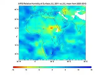 Studies predict that by the year 2050 the rainfall in Sub-Saharan Africa could drop by 10%, which will cause a major water shortage. This 10% decrease in precipitation would reduce drainage by 17% and the regions which are receiving 500–600 mm/year rainfall will experience a reduction by 50–30% respectively in the surface drainage.[27] Additionally, the Human Development Report predicts warming paired with 10% less rainfall in interior regions of Africa, which will be amplified by water loss due to water loss increase from rising temperature.[17] Droughts and floods are considered to be the most dangerous threat to physical water scarcity.[28] This warming will be greatest over the semi-arid regions of the Sahara, along the Sahel, and interior areas of southern Africa.[17]