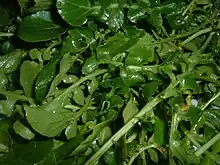 Watercress is listed in some sources as belonging to the genus Rorippa, although molecular evidence shows those aquatic species with hollow stems are more closely related to Cardamine than Rorippa.[4] Despite the Latin name, watercress is not particularly closely related to the flowers popularly known as nasturtiums (Tropaeolum majus). T. majus belongs to the family Tropaeolaceae, a sister taxon to the Brassicaceae within the order Brassicales.[5]