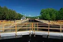 Construction of the Waterford Flight began in 1905 and took 10 years to complete.[1][2] The 5 massive locks dwarfed the previous iterations and were mandated to be 328 feet (100 m) long, 45 feet (14 m) wide, and 12 feet (3.7 m) deep.[2] These dimensions became the standard on the Barge Canal System and have been maintained to this day. In addition to the locks, there are two large guard gates at the northern end of the flight. These gates can be lowered to block additional flow of water from the Mohawk River through the locks to prevent damage during floods.[3] The locks have undergone periods of major restoration in the past couple decades, including replacement of lock doors and resurfacing of the concrete within the locks themselves.[4]
