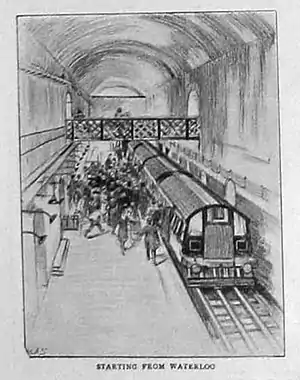 The underground station at Waterloo was located within the existing transverse arches of the main line station, with the arrival and departure platforms in separate arches, and a staircase access. Siding accommodation and a reversing siding were provided beyond the platforms: after disembarkation of passengers, an arriving train would continue forward to the reversing sidings, and then return to the departure platform. An additional lay-by siding was provided later.[16]
