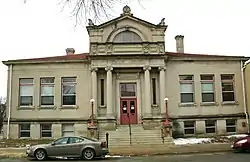 The Waterloo Public Library-East Side Branch is a historic building located in Waterloo, Iowa, United States. The public library was established here in 1896.[2] It operated out of two rented rooms, one on the east side of the Cedar River and other on the west side. The Carnegie Foundation offered a grant of $30,000 to build a new library, but disagreements erupted over whether to place the building on the east side or west side of the river.[3] They then agreed to grant $40,000 for a mid-river building, or the same amount for two buildings. In the end they agreed to grant the community $24,000 to build this building and a similar amount for the west side branch.[4] Waterloo architect John G. Ralston designed both buildings in the Neoclassical style. Both were dedicated on February 23, 1906. The single-story Bedford stone structure was built over a raised basement. It is one of the few stone buildings in Waterloo.[3] The building has a central portico with paired Ionic columns. It is part of a larger central mass that is oriented from front to back and sits across the lower hipped roof.